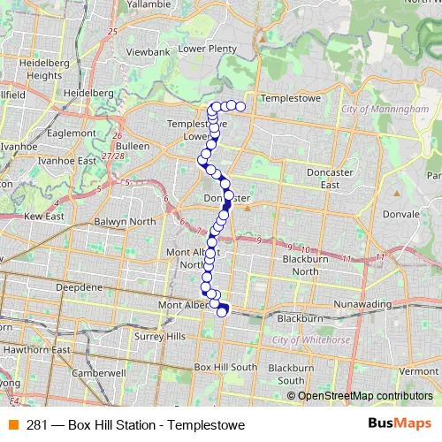 The first stop of the 281 bus route is Box Hill Bus Station/Station St and the last stop is Templestowe Village/James St. 281 (Box Hill Station - Templestowe) is operational during everyday.