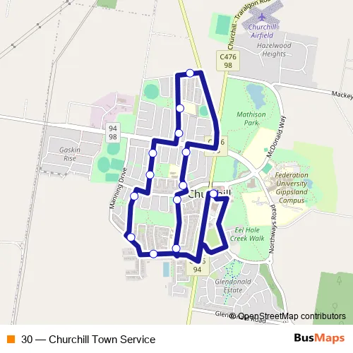 The first stop of the 30 bus route is Churchill SC/Georgina Pl and the last stop is Churchill SC/Georgina Pl. 30 (Churchill Town Service) is operational during everyday.