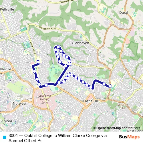 The first stop of the 3004 bus route is Oakhill College, Old Northern Rd and the last stop is William Clarke College, Morris Gr. 3004 (Oakhill College to William Clarke College via Samuel Gilbert Ps) is operational during on weekdays.