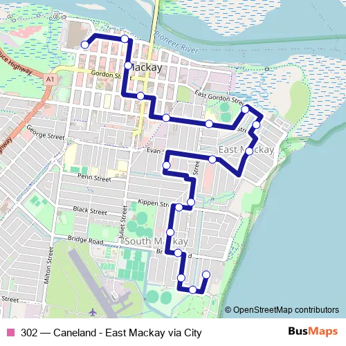 The first stop of the 302 bus route is Caneland station, stop A and the last stop is Beverley St at Bridge Road. 302 (Caneland - East Mackay via City) is operational during everyday.