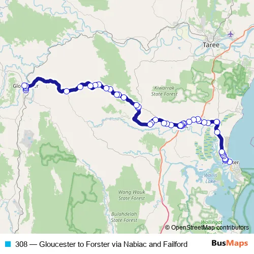 The first stop of the 308 bus route is Little St At Memorial Dr and the last stop is Denison St Before Billabong Lane. 308 (Gloucester to Forster via Nabiac and Failford) is operational during on weekdays.