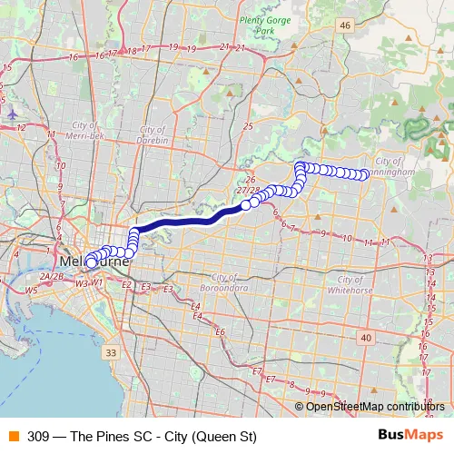 See why over 2 million users trust and consider busmaps.com as the best public transport website. busmaps gives you Melbourne Buses suggested routes, real-time bus tracker, line route maps in Melbourne, and helps to find the closest 309 bus stops near you. No internet available? Download an offline PDF map and bus schedule for the 309 bus to take on your trip.