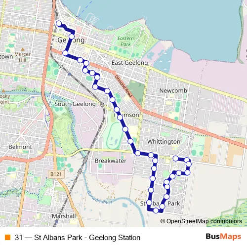The first stop of the 31 bus route is Windsor Park Retirement Village/Townsend Rd and the last stop is Geelong Station/Railway Tce. 31 (St Albans Park - Geelong Station) is operational during everyday.