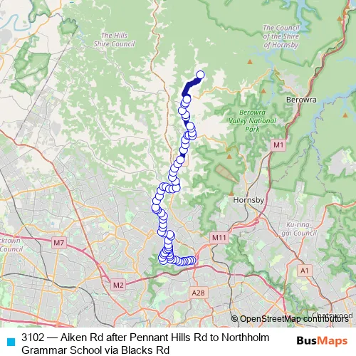 The first stop of the 3102 bus route is Aiken Rd After Pennant Hills Rd and the last stop is Northholm Grammar School, Cobah Rd. 3102 (Aiken Rd after Pennant Hills Rd to Northholm Grammar School via Blacks Rd) is operational during on weekdays.