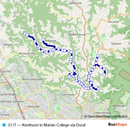 The first stop of the 3117 bus route is Farm Rd Opp Lang Rd and the last stop is Marian Catholic College, School Grounds. 3117 (Kenthurst to Marian College via Dural) is operational during on weekdays.