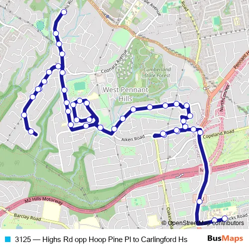 The first stop of the 3125 bus route is Highs Rd Opp Hoop Pine Pl and the last stop is Roselea Public School, North Rocks Rd. 3125 (Highs Rd opp Hoop Pine Pl to Carlingford Hs) is operational during on weekdays.