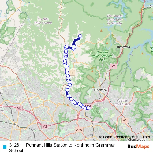 The first stop of the 3126 bus route is Pennant Hills Station, Railway St, Stand B and the last stop is Northholm Grammar School, Cobah Rd. 3126 (Pennant Hills Station to Northholm Grammar School) is operational during on weekdays.