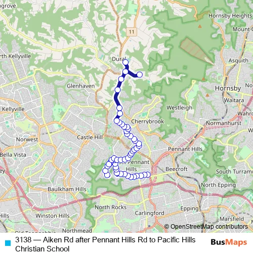 The first stop of the 3138 bus route is Aiken Rd After Pennant Hills Rd and the last stop is Pacific Hills Christian School Bus Bay, Quarry Rd. 3138 (Aiken Rd after Pennant Hills Rd to Pacific Hills Christian School) is operational during on weekdays.