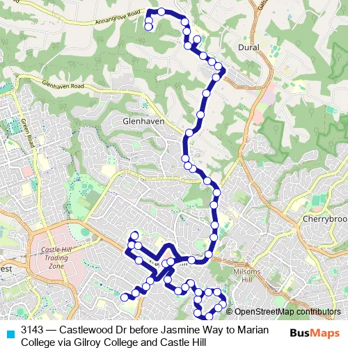 The first stop of the 3143 bus route is Castle Hill Station, Old Northern Rd, Stand A and the last stop is Marian Catholic College, School Grounds. 3143 (Castlewood Dr before Jasmine Way to Marian College via Gilroy College and Castle Hill) is operational during on weekdays.