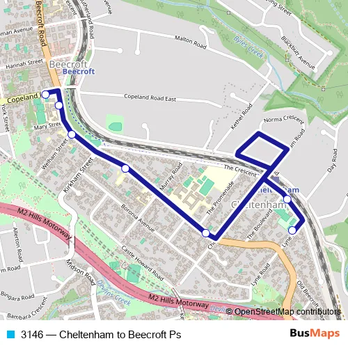 The first stop of the 3146 bus route is Lyne Rd Before The Crescent and the last stop is Beecroft Public School, Copeland Rd. 3146 (Cheltenham to Beecroft Ps) is operational during on weekdays.