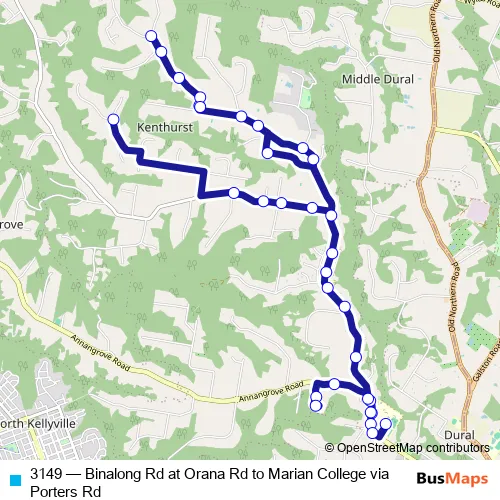 The first stop of the 3149 bus route is Binalong Rd At Orana Rd and the last stop is Marian Catholic College, School Grounds. 3149 (Binalong Rd at Orana Rd to Marian College via Porters Rd) is operational during on weekdays.