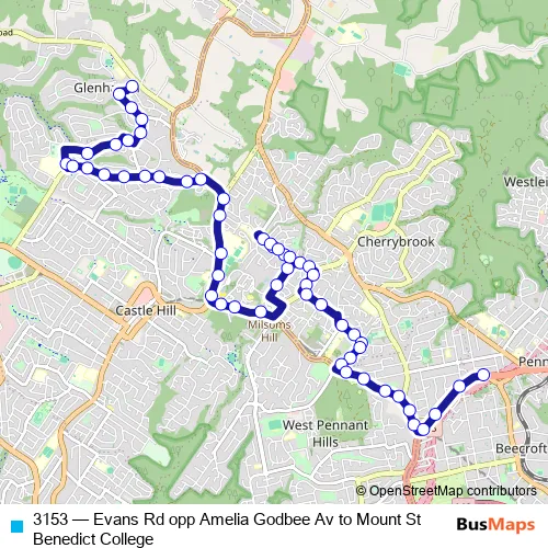 The first stop of the 3153 bus route is Evans Rd Opp Amelia Godbee Av and the last stop is Pennant Hills Rd Opp Mount St Benedict College. 3153 (Evans Rd opp Amelia Godbee Av to Mount St Benedict College) is operational during on weekdays.