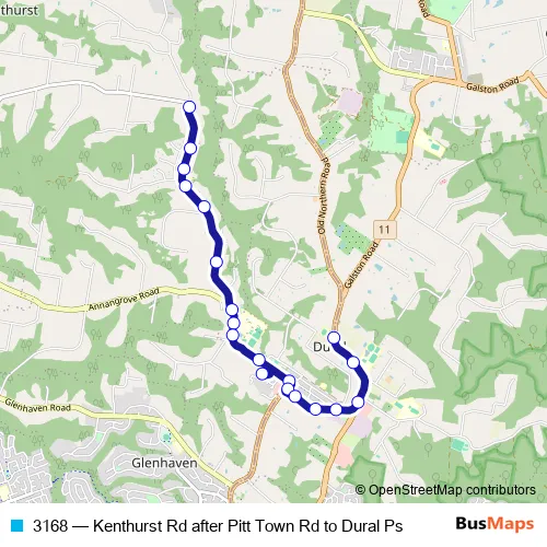 The first stop of the 3168 bus route is Kenthurst Rd Opp Pitt Town Rd and the last stop is Dural Public School, Old Northern Rd. 3168 (Kenthurst Rd after Pitt Town Rd to Dural Ps) is operational during on weekdays.