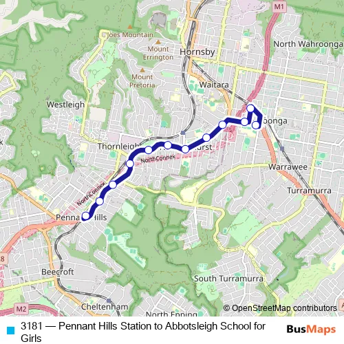 The first stop of the 3181 bus route is Pennant Hills Station, Railway St, Stand B and the last stop is Abbotsleigh College, Pacific Hwy. 3181 (Pennant Hills Station to Abbotsleigh School for Girls) is operational during on weekdays.