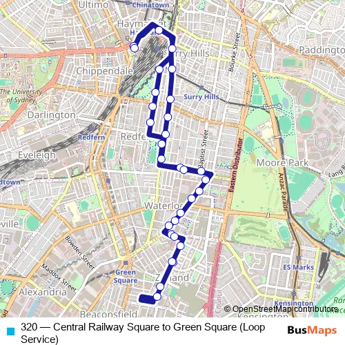 The first stop of the 320 bus route is Central Station, Railway Square, Stand K and the last stop is Central Station, Railway Square, Stand N. 320 (Central Railway Square to Green Square (Loop Service)) is operational during everyday.