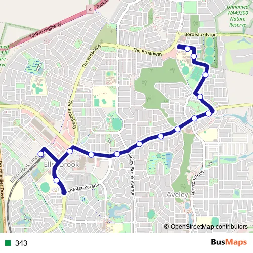 The first stop of the 343 bus route is Maffina Pde Aveley Secondary College Stand 1 and the last stop is Ellenbrook Stn Stand 12. 343 is operational during everyday.