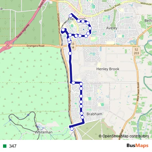 The first stop of the 347 bus route is Whiteman Park Stn Stand 10 and the last stop is Ellenbrook Stn Stand 12. 347 is operational during everyday.