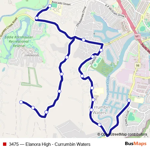 The first stop of the 3475 bus route is Nineteenth Ave at Elanora High School and the last stop is Currumbin Creek Rd near Mainsail St. 3475 (Elanora High - Currumbin Waters) is operational during on weekdays.