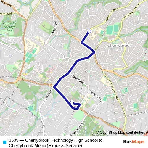 The first stop of the 3505 bus route is Cherrybrook Technology High School, Purchase Rd and the last stop is Cherrybrook Station, Bradfield Pde. 3505 (Cherrybrook Technology High School to Cherrybrook Metro (Express Service)) is operational during everyday.