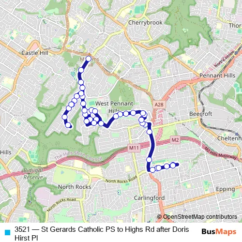 The first stop of the 3521 bus route is St Gerard's Catholic Primary School, North Rocks Rd and the last stop is Highs Rd After Doris Hirst Pl. 3521 (St Gerards Catholic PS to Highs Rd after Doris Hirst Pl) is operational during on weekdays.