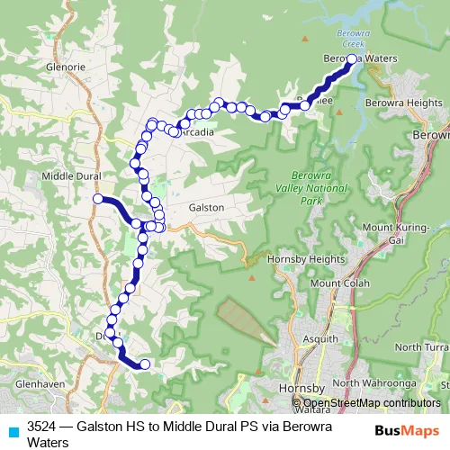 The first stop of the 3524 bus route is Pacific Hills Christian School Bus Bay, Quarry Rd and the last stop is Middle Dural Public School, Mid Dural Rd. 3524 (Galston HS to Middle Dural PS via Berowra Waters) is operational during on weekdays.