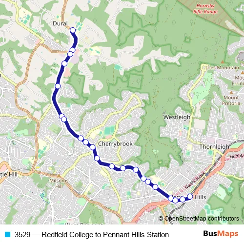 The first stop of the 3529 bus route is Redfield College Bus Bay, Old Northern Rd and the last stop is Pennant Hills Station, Railway St, Stand C. 3529 (Redfield College to Pennant Hills Station) is operational during on weekdays.