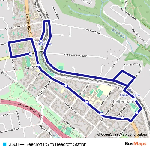 The first stop of the 3568 bus route is Beecroft Public School, Copeland Rd and the last stop is Beecroft Station, Wongala Cres. 3568 (Beecroft PS to Beecroft Station) is operational during on weekdays.