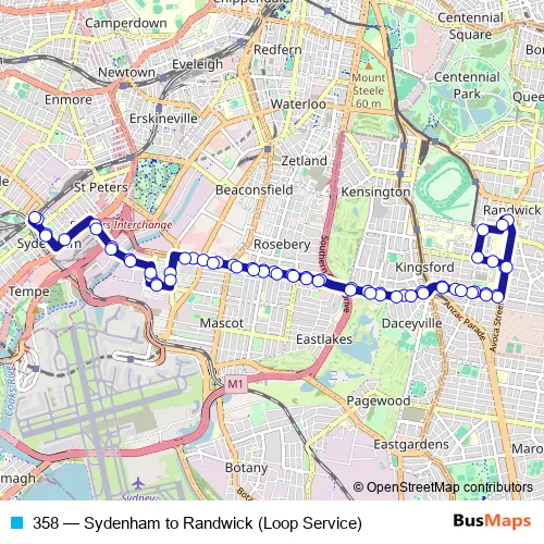 The first stop of the 358 bus route is Sydenham Station, Gleeson Av, Stand E and the last stop is Sydenham Station, Burrows Av, Stand A. 358 (Sydenham to Randwick (Loop Service)) is operational during everyday.