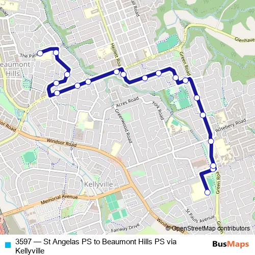 The first stop of the 3597 bus route is St Angela's Primary School, Harrington Av and the last stop is Beaumont Hills Public School, The Parkway. 3597 (St Angelas PS to Beaumont Hills PS via Kellyville) is operational during on weekdays.