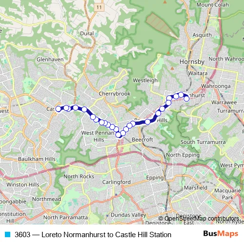 The first stop of the 3603 bus route is Loreto College South, Osborn Rd and the last stop is Castle Hill Station, Old Northern Rd, Stand B. 3603 (Loreto Normanhurst to Castle Hill Station) is operational during on weekdays.