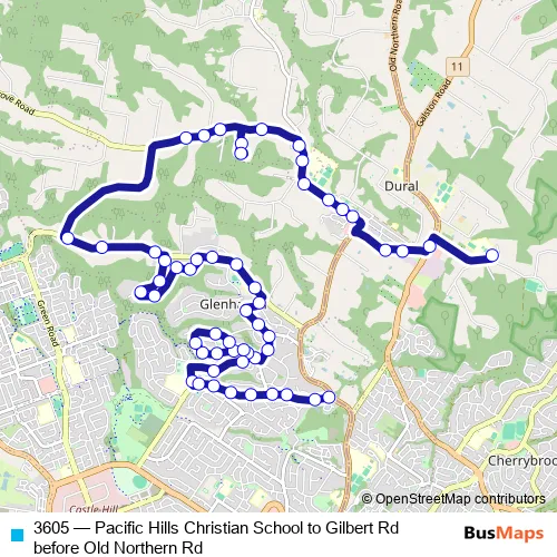 The first stop of the 3605 bus route is Pacific Hills Christian School Bus Bay, Quarry Rd and the last stop is Gilbert Rd At Old Northern Rd. 3605 (Pacific Hills Christian School to Gilbert Rd before Old Northern Rd) is operational during on weekdays.
