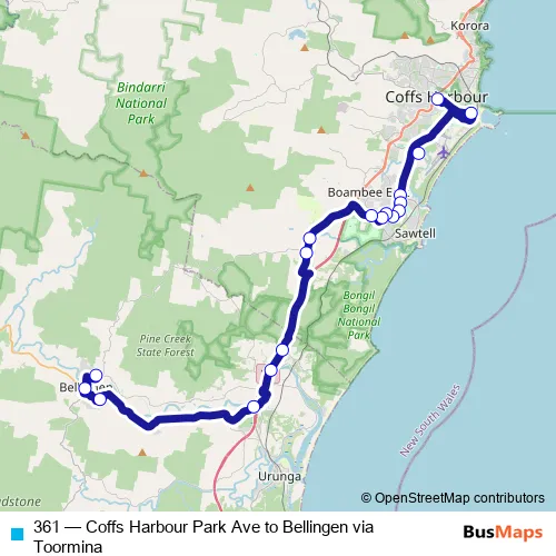 The first stop of the 361 bus route is Park Av Opp Little St and the last stop is Mccristal Dr After Jagera Dr. 361 (Coffs Harbour Park Ave to Bellingen via Toormina) is operational during on weekdays.