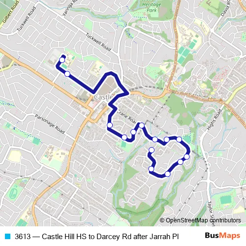 The first stop of the 3613 bus route is Castle Hill High School, Castle St and the last stop is Darcey Rd After Jarrah Pl. 3613 (Castle Hill HS to Darcey Rd after Jarrah Pl) is operational during on weekdays.