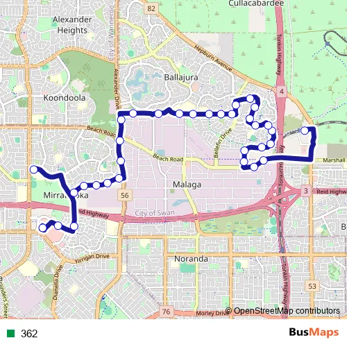 The first stop of the 362 bus route is Ballajura Stn Stand 8 and the last stop is Mirrabooka Station Stand 11. 362 is operational during everyday.