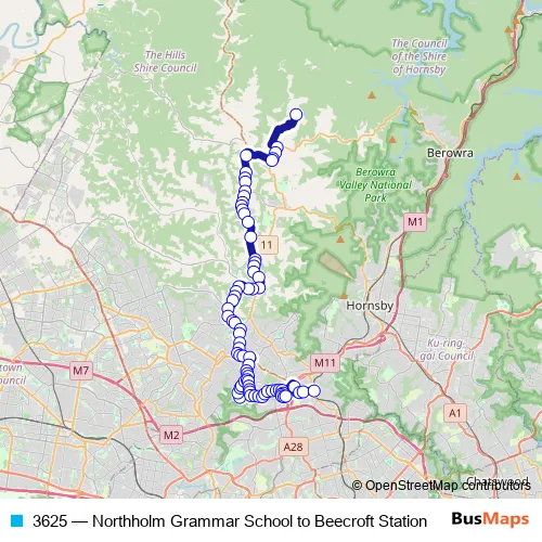 The first stop of the 3625 bus route is Northholm Grammar School, Cobah Rd and the last stop is Beecroft Station, Wongala Cres. 3625 (Northholm Grammar School to Beecroft Station) is operational during on weekdays.