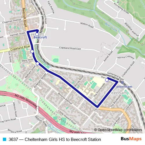 The first stop of the 3637 bus route is Cheltenham Girls High School, The Promenade and the last stop is Beecroft Station, Wongala Cres. 3637 (Cheltenham Girls HS to Beecroft Station) is operational during on weekdays.