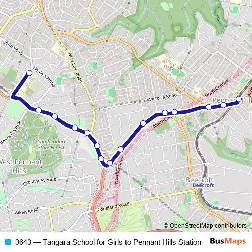 The first stop of the 3643 bus route is Tangara Girls School, Franklin Rd and the last stop is Pennant Hills Station, Railway St, Stand C. 3643 (Tangara School for Girls to Pennant Hills Station) is operational during on weekdays.