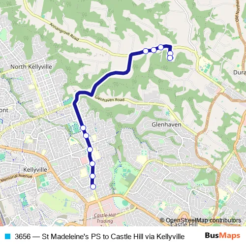 The first stop of the 3656 bus route is St Madeleine's Primary School, School Grounds and the last stop is Green Rd Opp St Pauls Av. 3656 (St Madeleine's PS to Castle Hill via Kellyville) is operational during on weekdays.