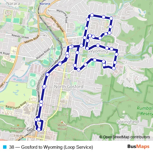 Bus 38 - Gosford to Wyoming (Loop Service) in North Gosford: Stops & Timetable