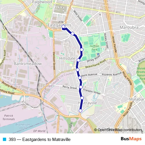 The first stop of the 393 bus route is Westfield Eastgardens, Lower Level, Stand B and the last stop is Bunnerong Rd After Shirley Cres. 393 (Eastgardens to Matraville) is operational during everyday.