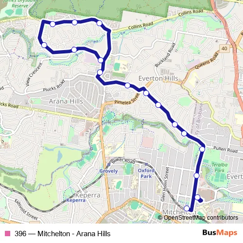 The first stop of the 396 bus route is Mitchelton Rail station and the last stop is Bunya Rd at Francis Road. 396 (Mitchelton - Arana Hills) is operational during on weekdays.