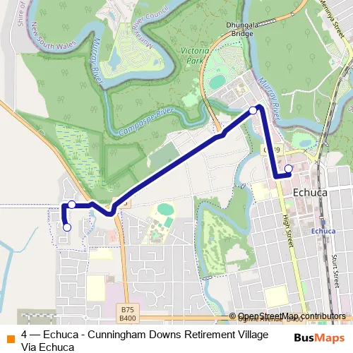 The first stop of the 4 bus route is Old Echuca Post Office/Hare St and the last stop is Echuca Community for the Aged/Hartshorn Dr. 4 (Echuca - Cunningham Downs Retirement Village Via Echuca) is operational during everyday.