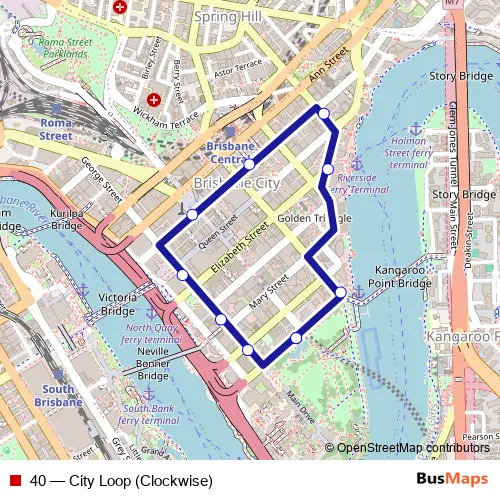 The first stop of the 40 bus route is Alice St Stop 99 at Albert St and the last stop is Alice St Stop 99 at Albert St. 40 (City Loop (Clockwise)) is operational during on weekdays.