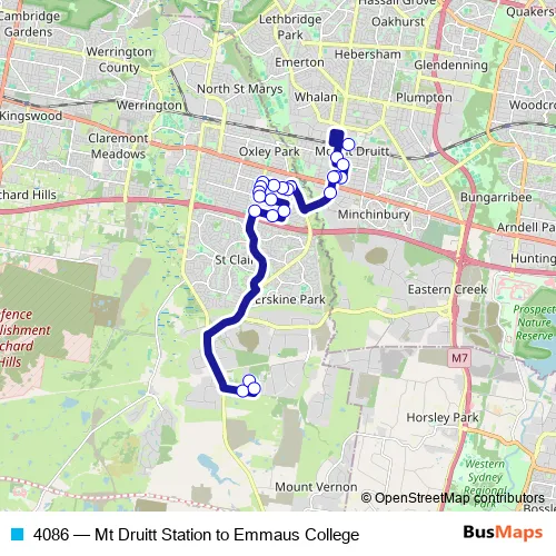 The first stop of the 4086 bus route is Mount Druitt Station, Stand C and the last stop is Emmaus Catholic College, School Grounds. 4086 (Mt Druitt Station to Emmaus College) is operational during on weekdays.