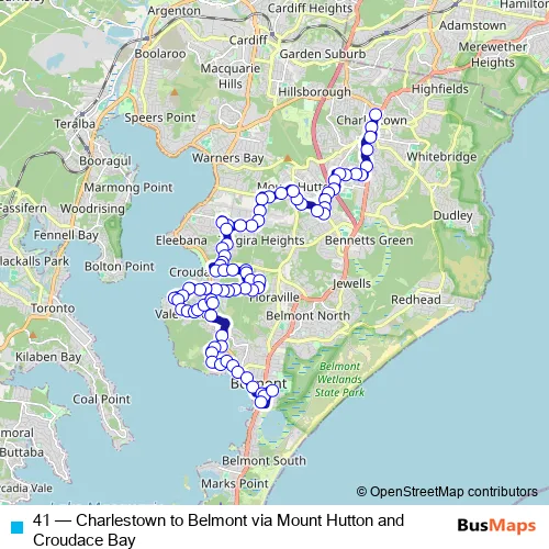 The first stop of the 41 bus route is Charlestown Square, Pearson St, Stand B and the last stop is Glover St Opp Church St. 41 (Charlestown to Belmont via Mount Hutton and Croudace Bay) is operational during everyday.