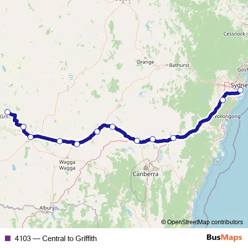 The first stop of the 4103 bus route is Central Station, Forecourt, Coach Bay 1 and the last stop is Griffith Station, Coach Stop. 4103 (Central to Griffith) is operational during on weekends.