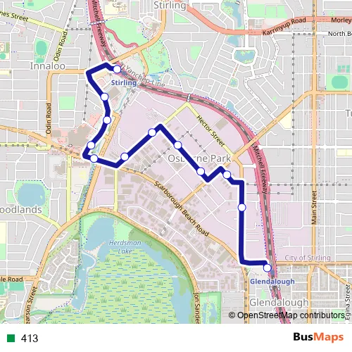 The first stop of the 413 bus route is Stirling Stn Stand 4 and the last stop is Glendalough Stn Stand 6. 413 is operational during on weekdays.