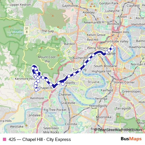 The first stop of the 425 bus route is Ann Street Stop 5 at Orient Hotel and the last stop is Cedarleigh Rd at Kenmore Village. 425 (Chapel Hill - City Express) is operational during everyday.