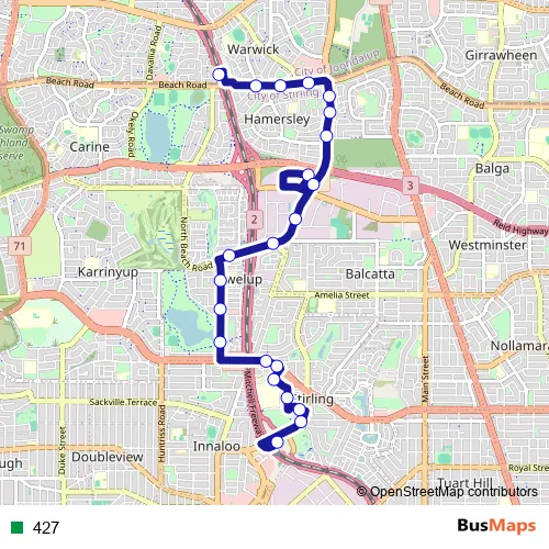 See why over 2 million users trust and consider busmaps.com as the best public transport website. busmaps gives you Perth Buses suggested routes, real-time bus tracker, line route maps in Perth, and helps to find the closest 427 bus stops near you. No internet available? Download an offline PDF map and bus schedule for the 427 bus to take on your trip.