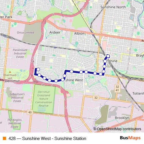 The first stop of the 428 bus route is Lovegrove Ave/Callaway Bvd and the last stop is Sunshine Station/Dickson St. 428 (Sunshine West - Sunshine Station) is operational during everyday.
